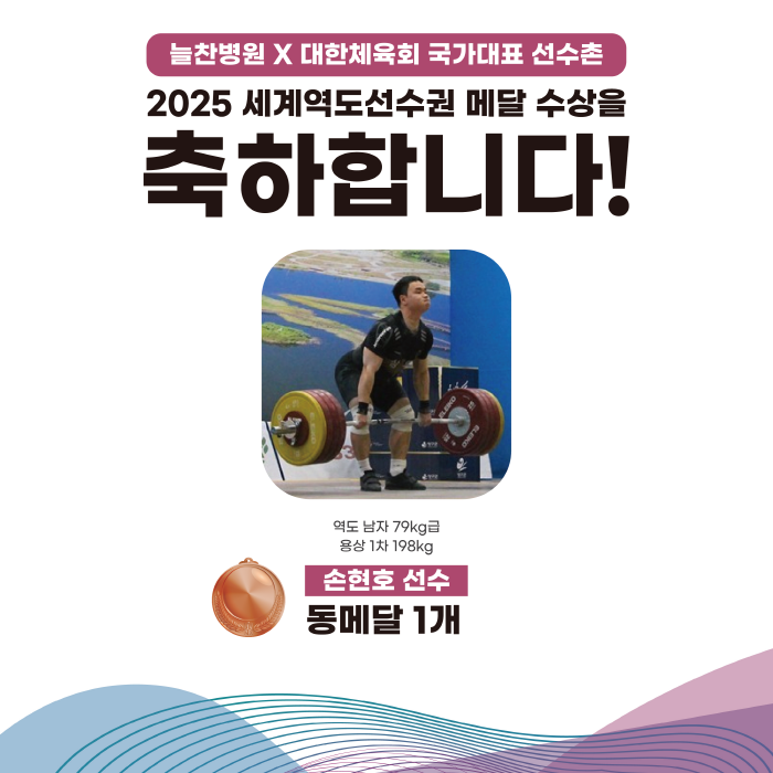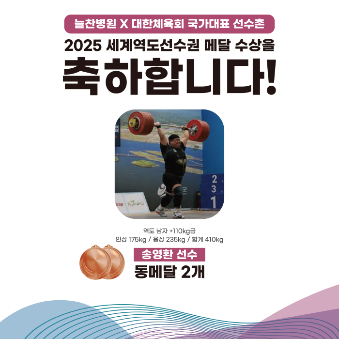 안녕하세요 대한체육회 국가대표선수촌 공식협력병원 늘찬병원입니다 2025 10월 2일부터 11일까지 노르웨이 푀르데에서 IWF 세계역도선수권대회가 개최되었습니다. 이번 대회는 국제역도연맹(IWF)이 체급을 개편한 이후 처음 열린 대회라는 점에서 의의가 있습니다. 해당 대회에 우리나라 역도 국가대표 선수들도 참가했는데요, 파리올림픽에서 은메달을 수상한 박혜정 선수를 필두로 '역도 드림팀'을 구성하였습니다. 2025 세계역도선수권에서 박혜정 선수는 기대를 저버리지 않고 역도 여자 86kg 이상급에서 금메달 3개를 목에 거는 쾌거를 이루었습니다. 손현호 선수는 역도 남자 79kg급 용상 1차에서 동메달 1개를 수여하였고, 송영환 선수는 역도 남자 110kg 이상급에서 동메달 2개를 수여하였습니다. 우리나라 역도 국가대표 선수들은 이번 대회에서 금메달 3개, 동메달 3개를 수상하였는데요. 열심히 도전한 선수들에게 박수를 보내드립니다 저희 늘찬병원은 대한체육회 국가대표선수촌 공식협력병원으로서 항상 선수들이 최상의 컨디션으로 훈련을 받을 수 있도록 서포트하고 있습니다. 앞으로도 대한역도연맹 국가대표 주치의로서, 대한체육회 국가대표선수촌 공식협력병원으로서 선수들에게 양질의 의료 서비스를 제공할 수 있도록 노력하겠습니다! 감사합니다. |