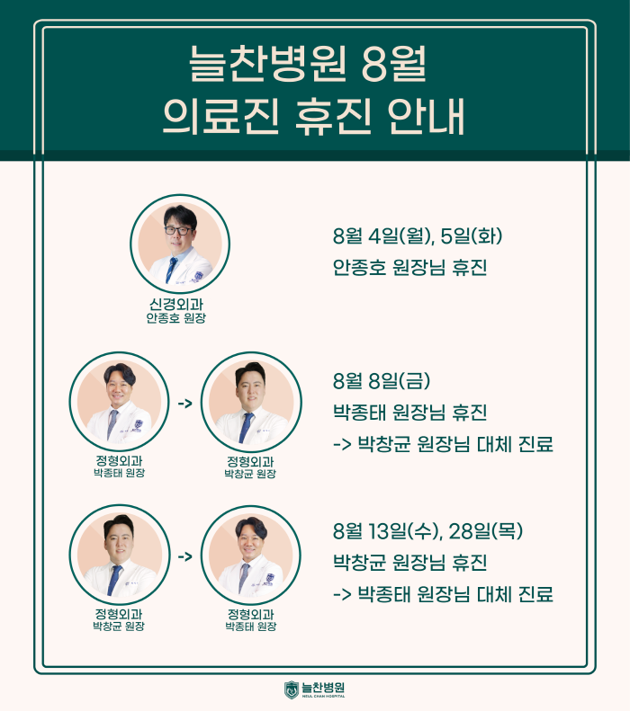 안녕하세요 대한체육회 국가대표선수촌 공식협력 병원 늘찬병원입니다! 8월 토요일 진료 및 휴진 안내드립니다. <늘찬병원 8월 토요일 진료 의료진 안내> 8/2 (토)-박종태원장님, 안종호원장님 8/9 (토)-서은호원장님, 박창균원장님 8/16(토)-박종태원장님, 안종호원장님 8/23(토)-서은호원장님, 박창균원장님 8/30(토)-박종태원장님, 안종호원장님 <늘찬병원 8월 휴진 안내> 8/4(월) - 8/5(화) 안종호 원장님 휴진 8/8(금) 박종태 원장님 휴진 -> 박창균 원장님 대체 진료 8/13(수), 8/28(목) 박창균 원장님 휴진 -> 박종태 원장님 대체 진 <늘찬병원 8월 내과 휴진 안내> 내과 원장님 해외 연수로 인해 8월 내과 휴진합니다. * 내과 진료는 늘찬의원에서 가능합니다 서울시 중랑구 겸재로 180 2층, 4층 02-493-7800 - 말씀드린 8월 토요일 의료진 진료 및 휴진 안내 사항을 참고하셔서 내원하는데 불편함 없으시기 바랍니다! 감사합니다. |