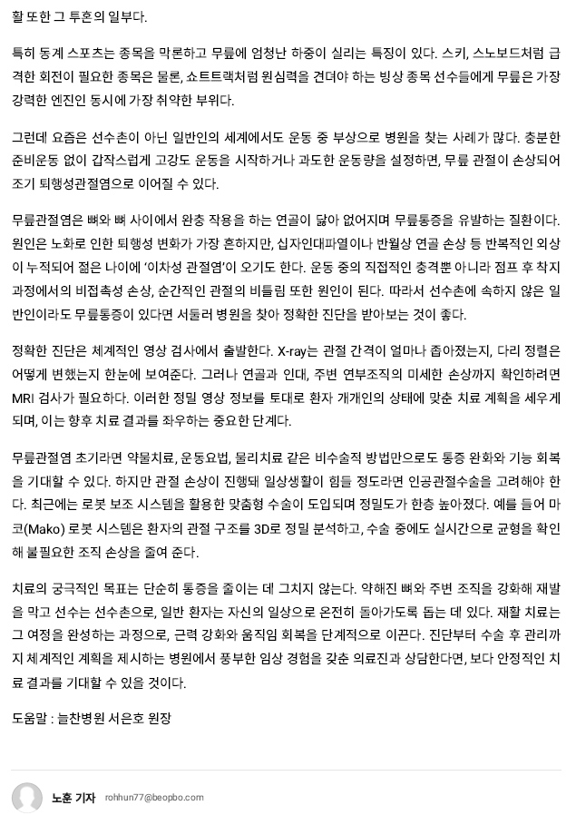 선수 아닌 일반인도 피할 수 없는 무릎통증, 관절염 치료의 시작은