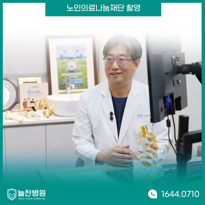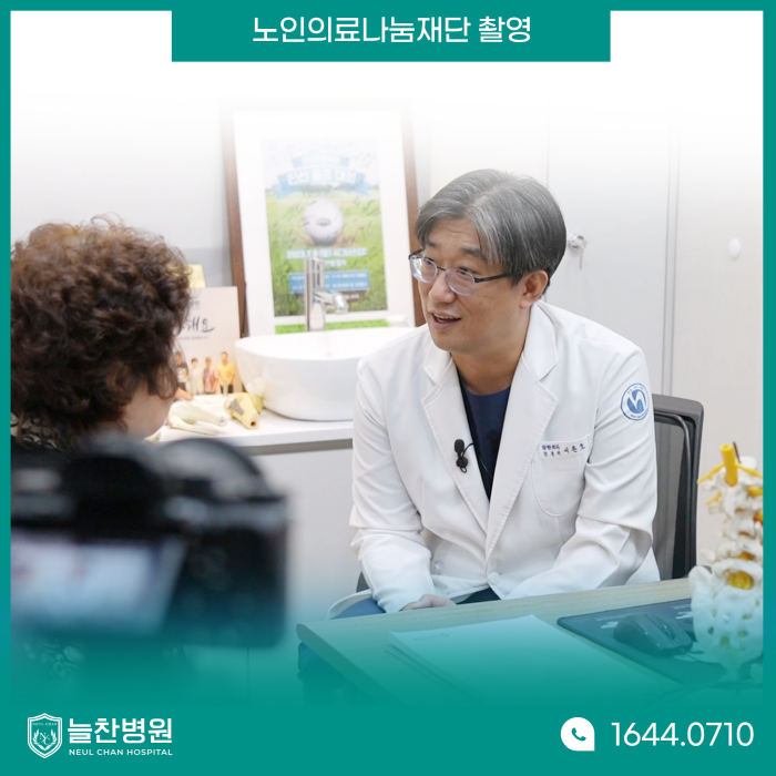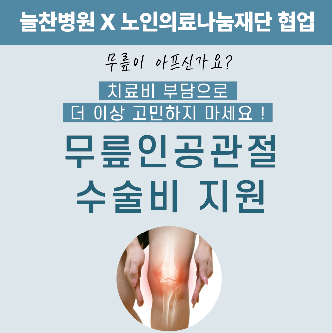 서은호 대표원장님은 이번 촬영을 통해 "수술 후 환자분들이 편안하게 걷고 움직이는 모습을 보면 보람을 느낀다"라며 "노인의료나눔재단을 통해 많은 환자분들이 부담없이 수술을 받고 다시 편안하게 걸을 수 있게 되어 감사드린다"라는 소감을 전했습니다. 늘찬병원은 앞으로도 내원하는 환자분들이 다시 건강한 일상으로 돌아가실 수 있도록 항상 최선을 다하겠습니다! 감사합니다. 늘찬병원 x 노인의료나눔재단 무릎 인공관절 수술비 지원 대상자 → 건강보험급여 '인공관절수술(무릎)' 인정기준에 준하는 질환자 수술비 지원 → 최대 240만 원 지원 (진료비, 검사비, 무릎인공관절 수술비 등) 상담 방법 → 늘찬병원 상담실에서 상담해 주세요! (문의전화 : 1644-0710) |