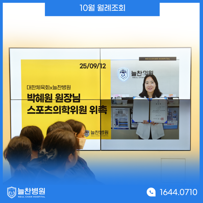 지난달에 있었던 병원 소식도 되돌아봤는데요 먼저 늘찬의원에서 진료를 보고 계신 박혜원 원장님께서 대한체육회 국가대표선수촌 스포츠의학위원에 위촉되셨다는 소식입니다. 늘찬병원은 대한체육회 국가대표선수촌 공식협력병원으로서 이번에 스포츠의학위원에 위촉되신 박혜원 원장님과 함께 앞으로도 국가대표 선수들이 안전하게 훈련을 받도록 아낌없이 서포트 할 예정입니다.