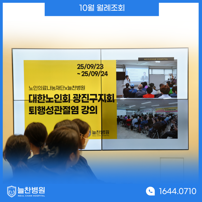 다음으로는 저희 병원에서 꾸준히 하고 있는 노인의료나눔재단 강연 소식입니다. 이번에는 대한노인회 광진구지회에서 저희 늘찬병원의 간호부장님이 직접 퇴행성관절염 강연을 해주셨습니다.