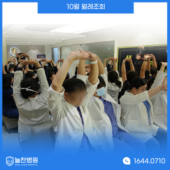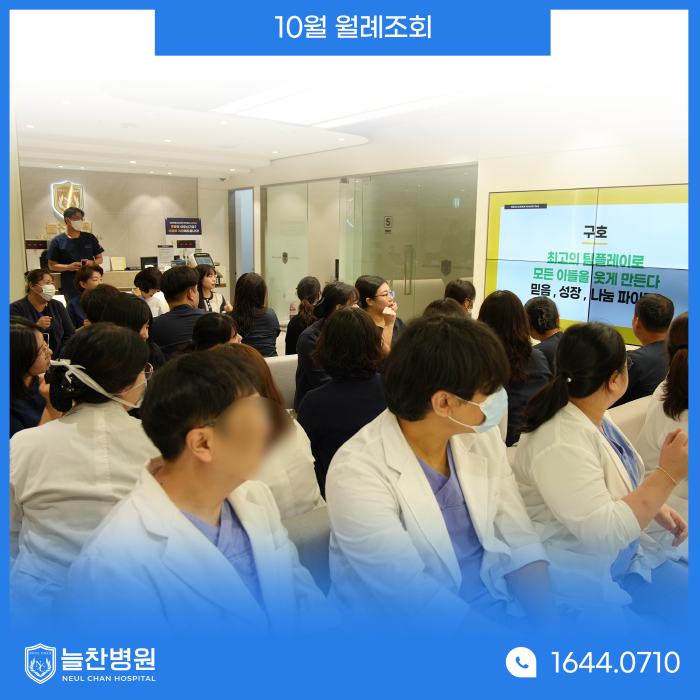 "최고의 팀플레이로 모든 이들을 웃게 만든다 믿음, 성장, 나눔 파이팅!" 늘찬병원의 구호를 제창하며 이번 월례조회도 마무리했습니다. |
