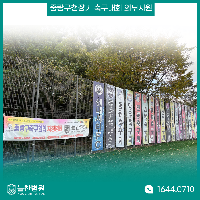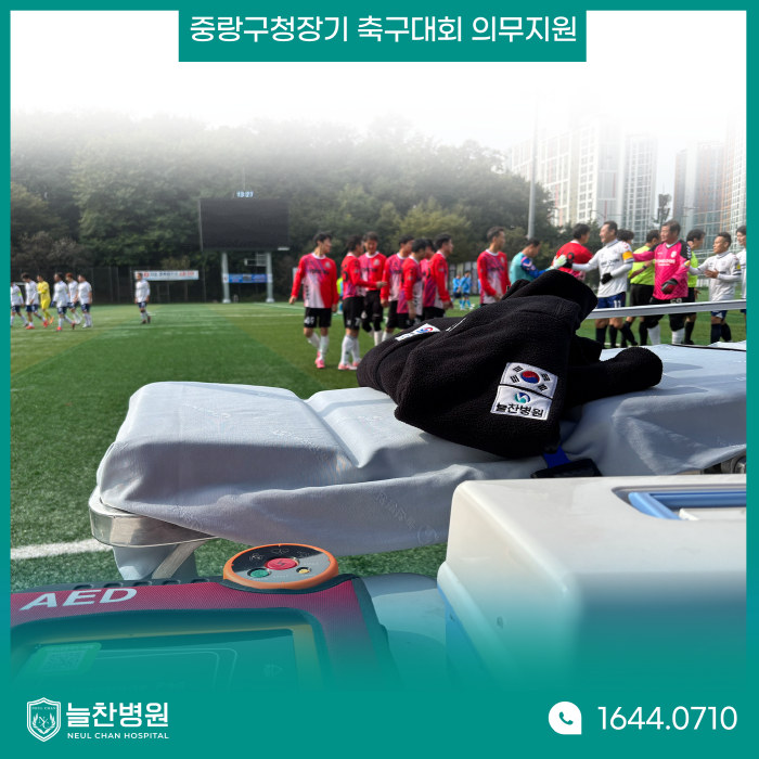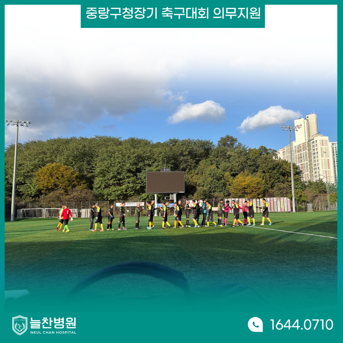 지난 10월 26일과 11월 2일 양일간 제37회 중랑구청장기 축구대회가 진행되었습니다. 중랑구체육회에서 주최한 이번 대회는 중랑구립잔디운동장에서 관람할 수 있었습니다. 저희 늘찬병원은 선수들이 안전하게 경기에 참여할 수 있도록 의무 지원을 했으며, 앰뷸런스 협조를 통해 급박한 상황에서 유연하게 대처할 수 있도록 하였습니다. 중랑구축구협회 공식지정병원인 저희 늘찬병원에서 의무지원에 신경 썼기 때문에 이번 대회 역시 다행히 큰 사고 없이 무사히 종료되었습니다.