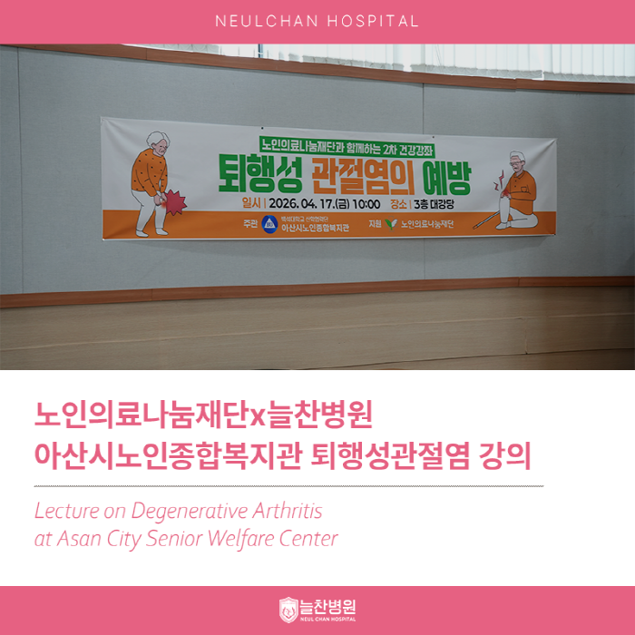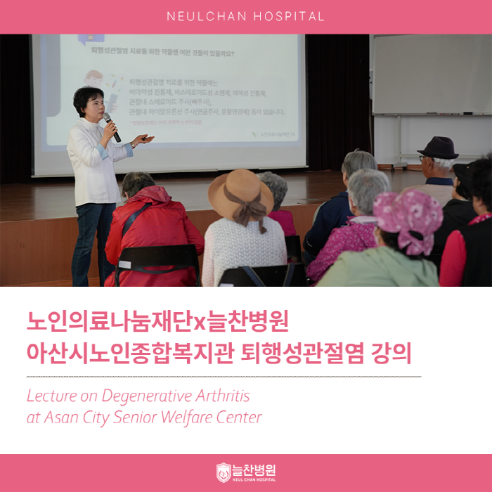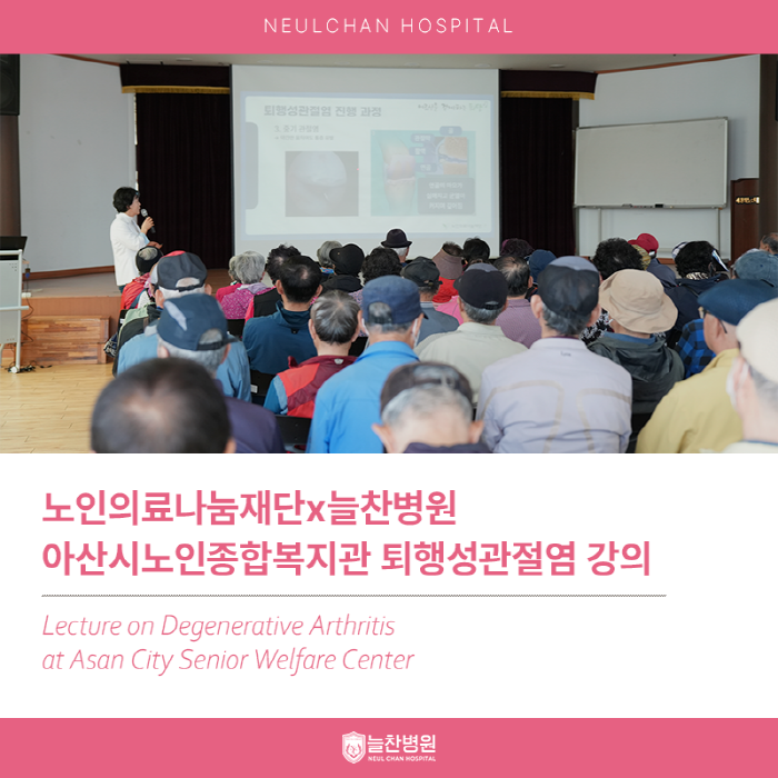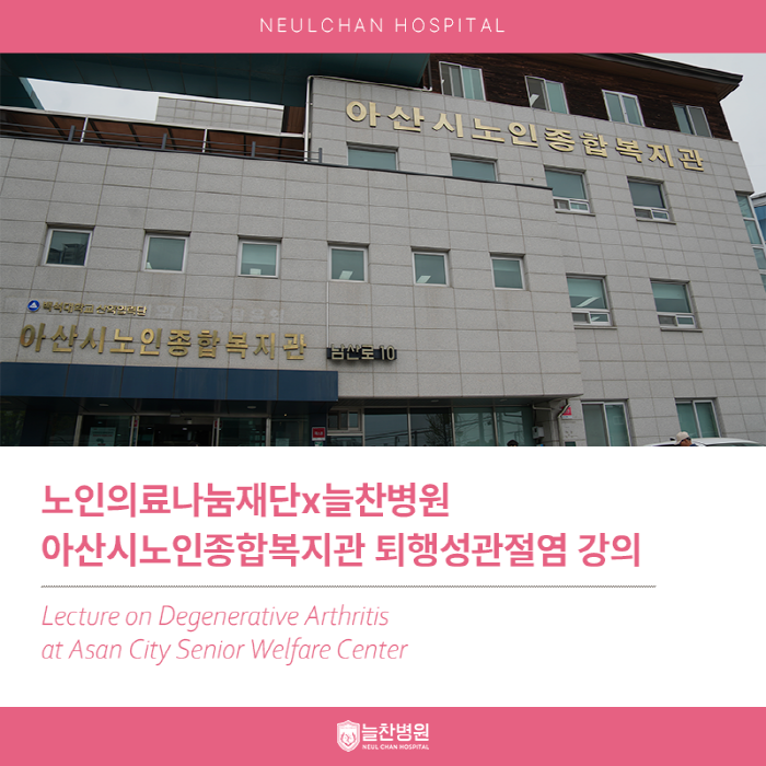 저희 늘찬병원은 노인의료나눔재단과 함께하는 '퇴행성관절염 강연'을 통해 질환에 대한 올바른 정보를 전달하고, 수술비 지원 사업의 상세 내용을 안내해 드리고 있습니다. 지난 17일 저희가 찾은 곳은 어르신들의 주체적인 삶과 지역 공동체의 성장을 위해 힘쓰고 있는 '아산시노인종합지관'입니다.